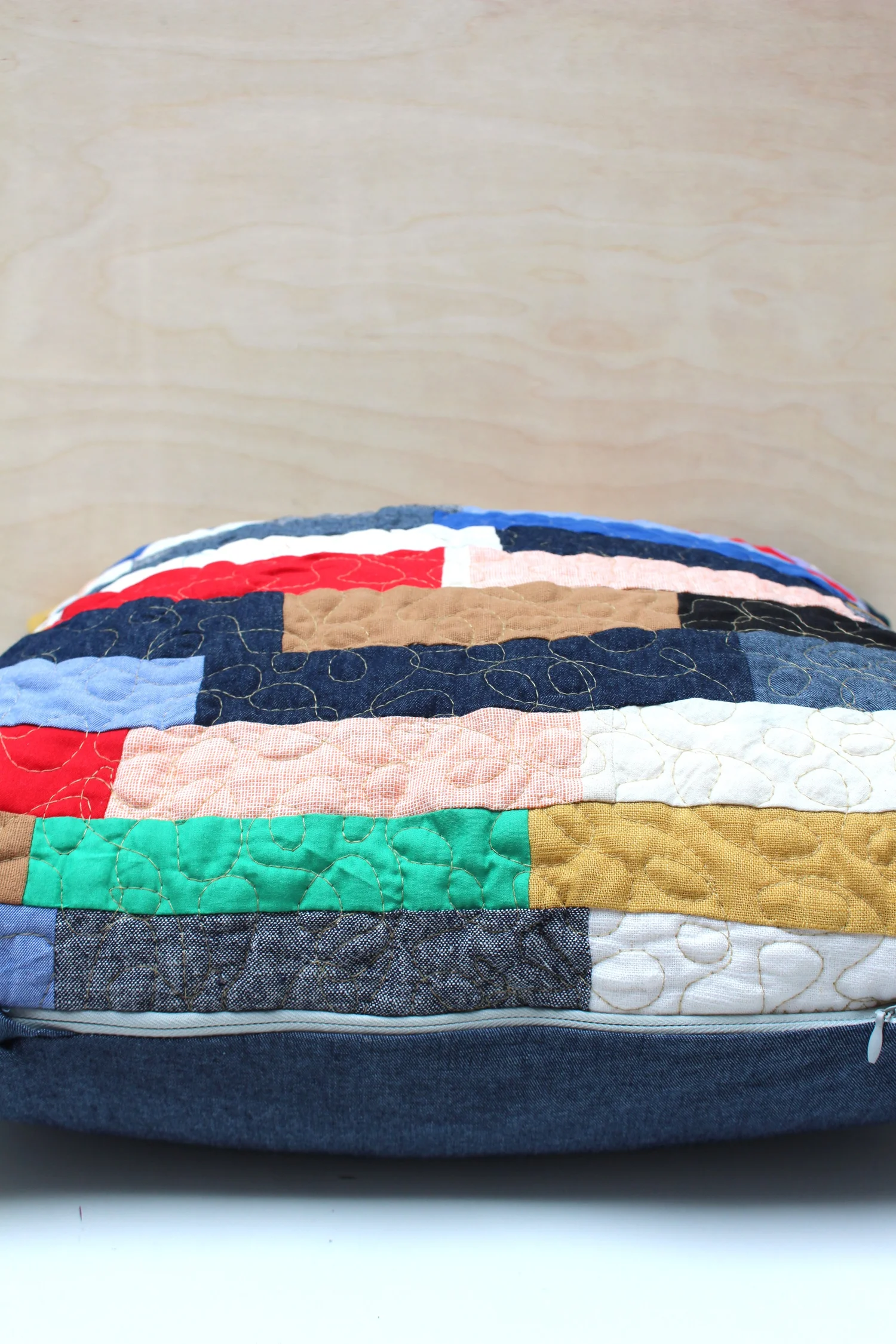 Hand made in the studio. unique quilted cushion with indigo denim back.   Shop